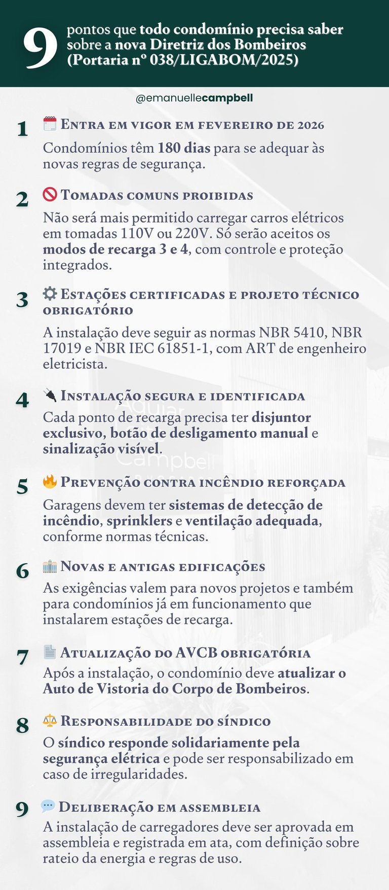 A partir do término desse prazo, as instalações elétricas utilizadas para recarga de veículos deverão estar integralmente adequadas aos parâmetros estabelecidos pela norma. Já as demais adaptações estruturais (como sistemas de detecção e combate a incêndio) terão seus prazos definidos pelos Corpos de Bombeiros de cada Estado, conforme a realidade local.